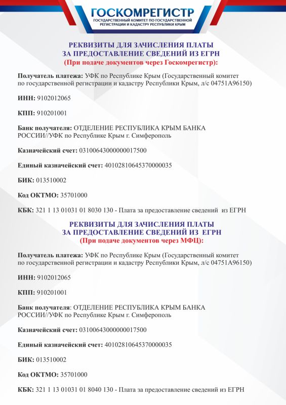 Государственный комитет по государственной регистрации и кадастру Республики Крым информирует заявителей об изменении банковских реквизитов для зачисления платы за предоставление сведений из Единого государственного реес
