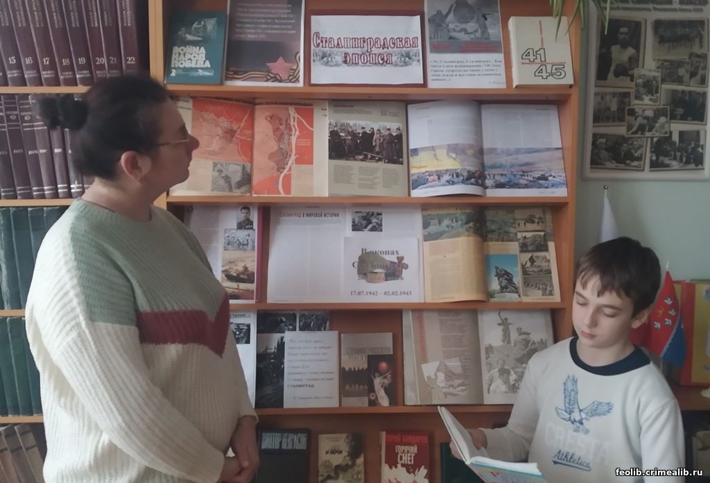 2 февраля в Береговой сельской библиотеке им. Г. Свиридова для читателей прошел час мужества «Сталинград выстоял. Сталинград победил», приуроченный к 80-летию Победы в Сталинградской битве. Заведующая Галина Свичкарь рассказала о мужестве и героизме советских солдат и офицеров, жителей города в 200-дневном сражении с многотысячными группировками немецко-фашистских войск. Ребята и взрослые узнали о выдающемся командующем Василии Ивановиче Чуйкове, о подвигах защитников дома Якова Павлова, девятнадцатилетнего связиста Матвея Путилова. К мероприятию была оформлена книжная выставка «Сталинградская эпопея». В память о победе в великой битве участники мероприятия прочитали стихи и рассказы о Сталинграде.