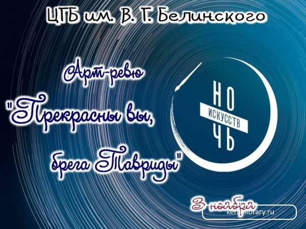 Керченская ЦБС в очередной раз присоединилась к Общероссийской культурной акции «Ночь искусств», мероприятия которой проходят в этом году под девизом «Россия объединяет». Накануне Дня народного единства, 3 ноября, ЦГБ им. В. Г. Белинского пригласила читателей и жителей города на арт-ревю «Прекрасны вы, брега Тавриды».