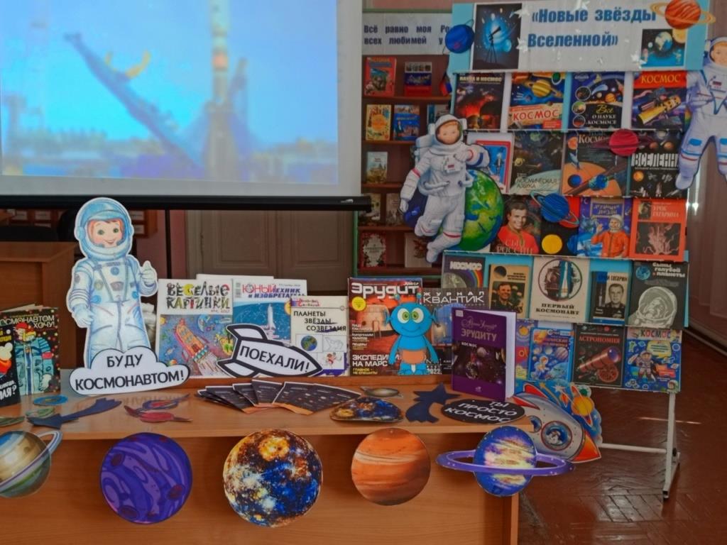Для юных «звездоплавателей» были проведены викторина «Космическая азбука» и обзор книжной выставки, а затем ребята выступили в роли планет Солнечной системы и продекламировали посвящённые им стихи.
