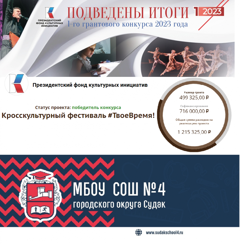 Кросскультурный фестиваль #ТвоеВремя!, ставший победителем конкурса Президентского фонда культурных инициатив, получит полмиллиона (!) рублей на создание условий для продвижения через кросс-культурные форматы традиционных российских ценностей; формирования культурно-познавательного, образовательно-патриотического; духовно-нравственного интереса и гражданской инициативности среди детей, молодежи и горожан г.Судак