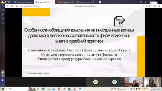 На конференции в формате видеоконференцсвязи Крымский юридический институт (филиал) Университета прокуратуры Российской Федерации представляли: студенты 4 курса Михайлова Анастасия Дмитриевна с докладом на тему «Особенности обращения взыскания на иностранные активы должника в делах о несостоятельности физических лиц: анализ судебной практики», Копцев Максим Вячеславович с докладом на тему: «Центральный Банк Российской Федерации как ключевой субъект финансового регулирования в условиях политической и финансово-экономической нестабильности», а также студентка 1 курса Максимкина Дарья Александровна с докладом на тему «Участие прокурора в защите прав человека в информационной среде».