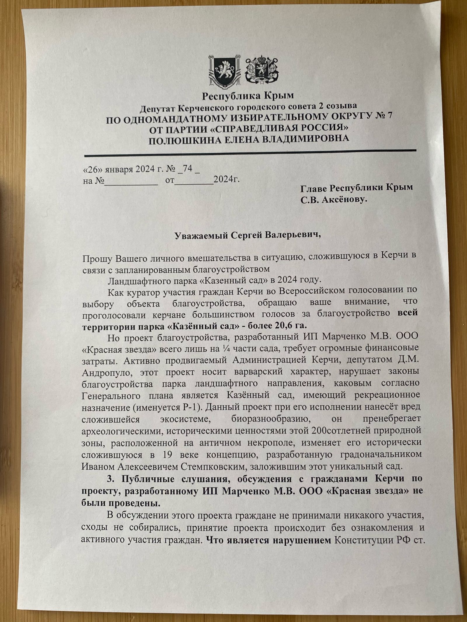 На мои письма Главе администрации города С.А. Брусакову и Главе муниципального образования городской округ Керчь, председателю керченского городского совета РК 2 созыва О.С. Солодиловой о необходимости публичных слушаний, получен письменный отказ.