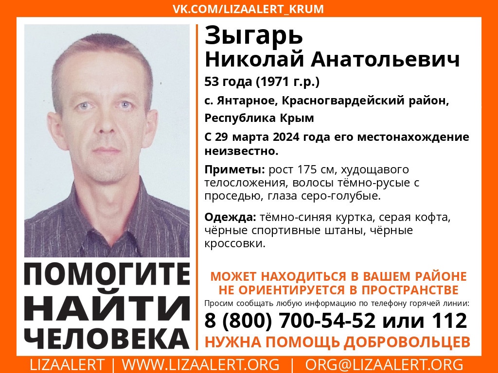 Николай Зыгарь ушел из дома в селе Янтарное в неизвестном направлении 29 марта.