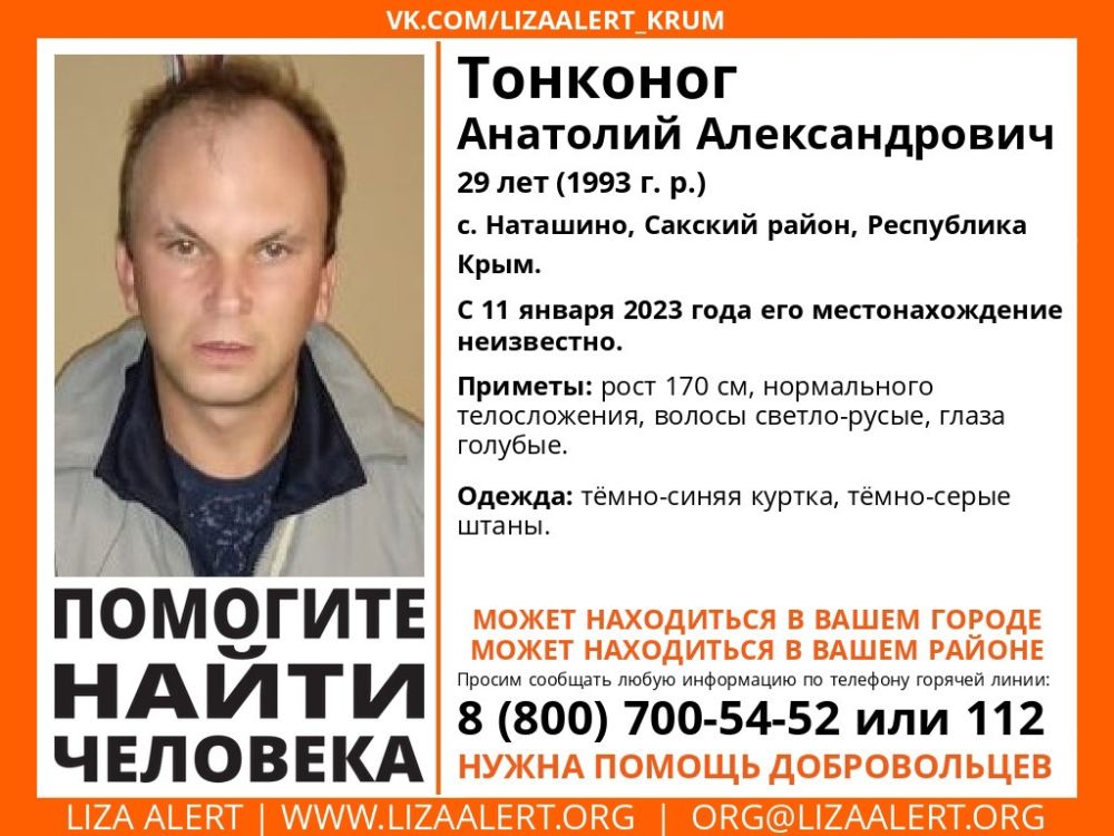В селе Наташино Сакского района Республика Крым пропал Тонконог Анатолий Александрович 1993 г.р..