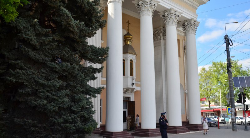 Эффектное трёхэтажное здание с увенчанным массивным фронтоном портиком изначально было светским. Здесь располагался Дом офицеров Таврического военного округа, а впоследствии - Симферопольского высшего военно-политического строительного училища. В 1995 году часть здания передали во временное пользование Крымской епархии Украинской православной церкви. Это самопровозглашённая религиозная организация, созданная в 1992 году. Чтобы придать светскому зданию православный вид, раскольники пристроили на фасаде между колоннами оригинальную «навесную» часовню.