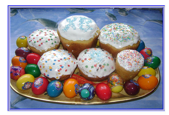 Главными угощениями на Пасху традиционно являются крашеные яйца и куличи.