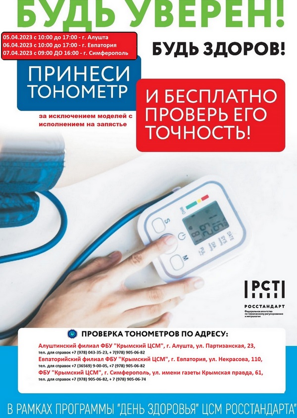 С 5 по 7 апреля 2023 года в Алуште, Евпатории и Симферополе пройдет Всероссийская акция «Будь уверен! Будь здоров!». Специалисты ФБУ «Государственный региональный центр стандартизации, метрологии и испытаний в Республике Крым» бесплатно проведут прием граждан для проверки контроля точности бытовых тонометров артериального давления.